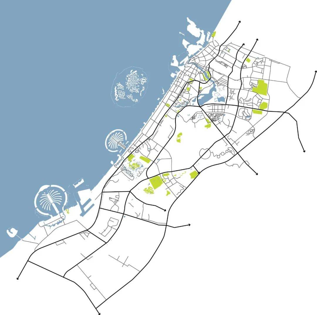 对迪拜路网,则可以这么看:有三条“东北-西南向”的快速路(E11、E311、E611)一层包一层,可以简单粗略理解为“内环-中环-外环”,然后有更多条相对较短的“西北-东南向”快速路与这三条路垂直相切,以此形成了迪拜的主路网。