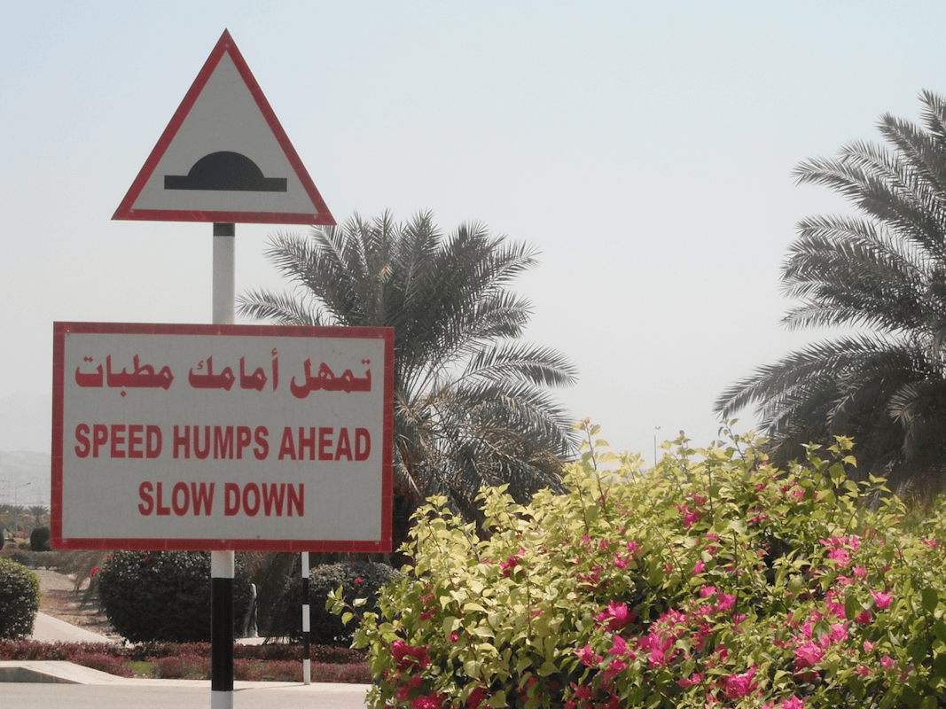毕竟,大转盘如果你一分心开进去,可能最多就是让后车来个急刹、按几声喇叭再加上愤怒地ya himar几声问候你;Speed Bump 如果你没注意全速开过去,那恭喜你,整辆车(以及你!)都要经历仿佛狠狠撞上一堵墙的巅峰体验,绝对成为你在阿联酋人生记忆中的“高光时刻”。