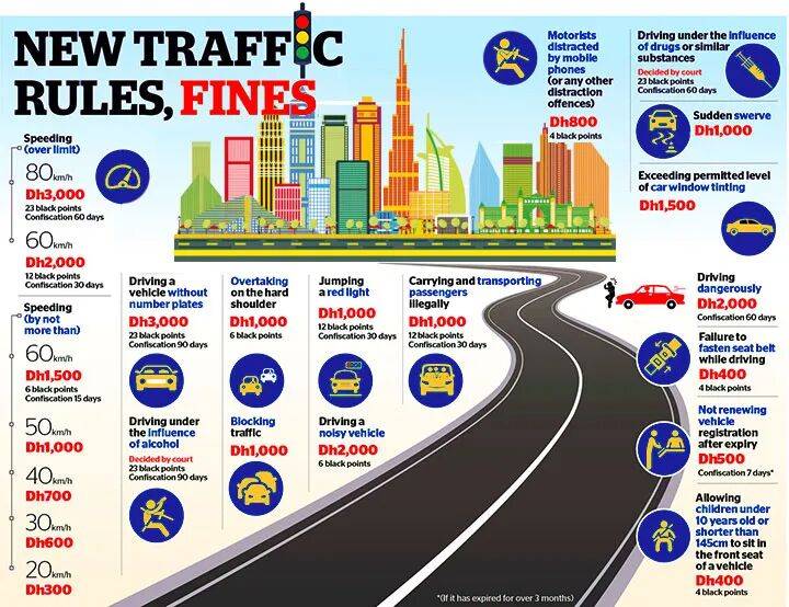 迪拜这边就是另一种画风了,一年可以给你24个黑点(black points),扣分的容忍度相当大;但罚款嘛,就是冲着一定要让你肉痛到窒息来了。