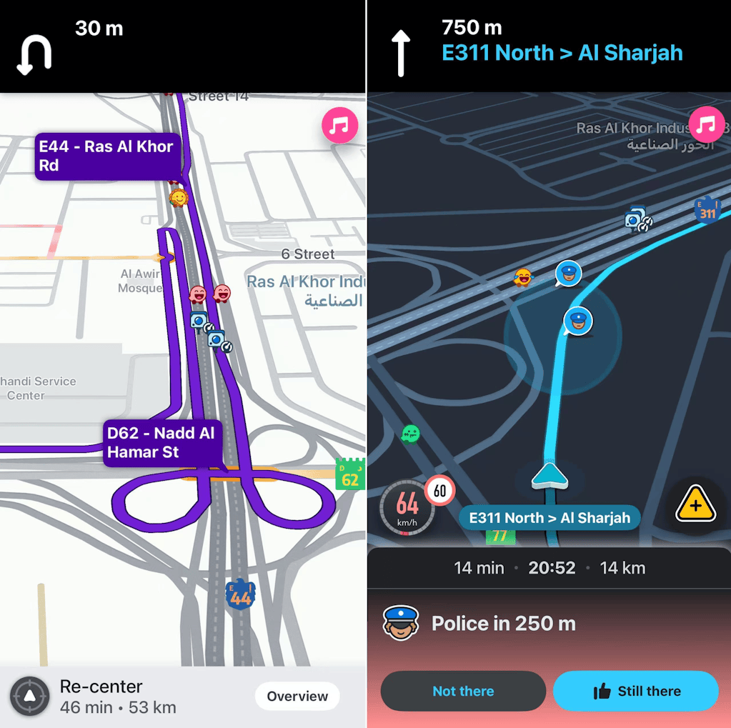 不过,一旦说回导航,Waze 完全能秒杀Google Maps。得益于地头蛇的优势,Waze对本地路网的情况掌握得非常透彻,知道快速路上每个匝道的走向、熟悉每条小路有几个车道、也知道哪些是内部道路需要通行证。这样,每当你开在迪拜的街头,不论前方是复杂的立交还是多奇葩的分岔口,Waze都能及时为你提供准确、清晰的引导。