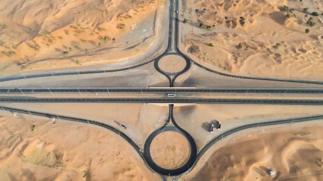 没错,在阿联酋、甚至整个中东地区都不那么喜欢设红绿灯。除了用立交桥与匝道解决的快速路互通,和少数用红绿灯解决的地面大路口外,迪拜的大小路口几乎都是用一个又一个大转盘来解决的。