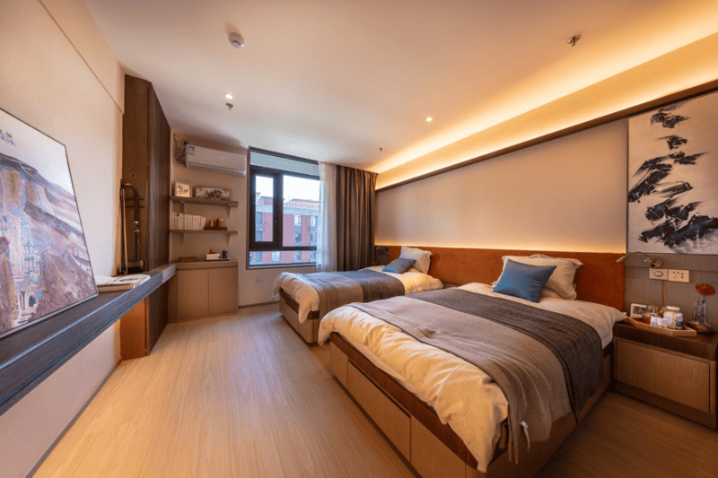 千禾养老(韩村河院)地址位于房山区韩村河镇龙门生态园内,园区绿树环绕、空气清新,老人日常可在园林中散步、观景,亲属探访时亦能共享自然之美。院内设有402张床位,房型涵盖单人间、标准间及套间,每个房间均配备独立卫生间、日常家具家电、多层净化直饮水机及千禾自主研发的无线呼叫系统,保障居住安全与舒适。值得一提的是,全院采用地暖供暖,老人可自行调节室内温度,且供暖时间较市政供暖延长一个月,确保冬日的持续温暖。