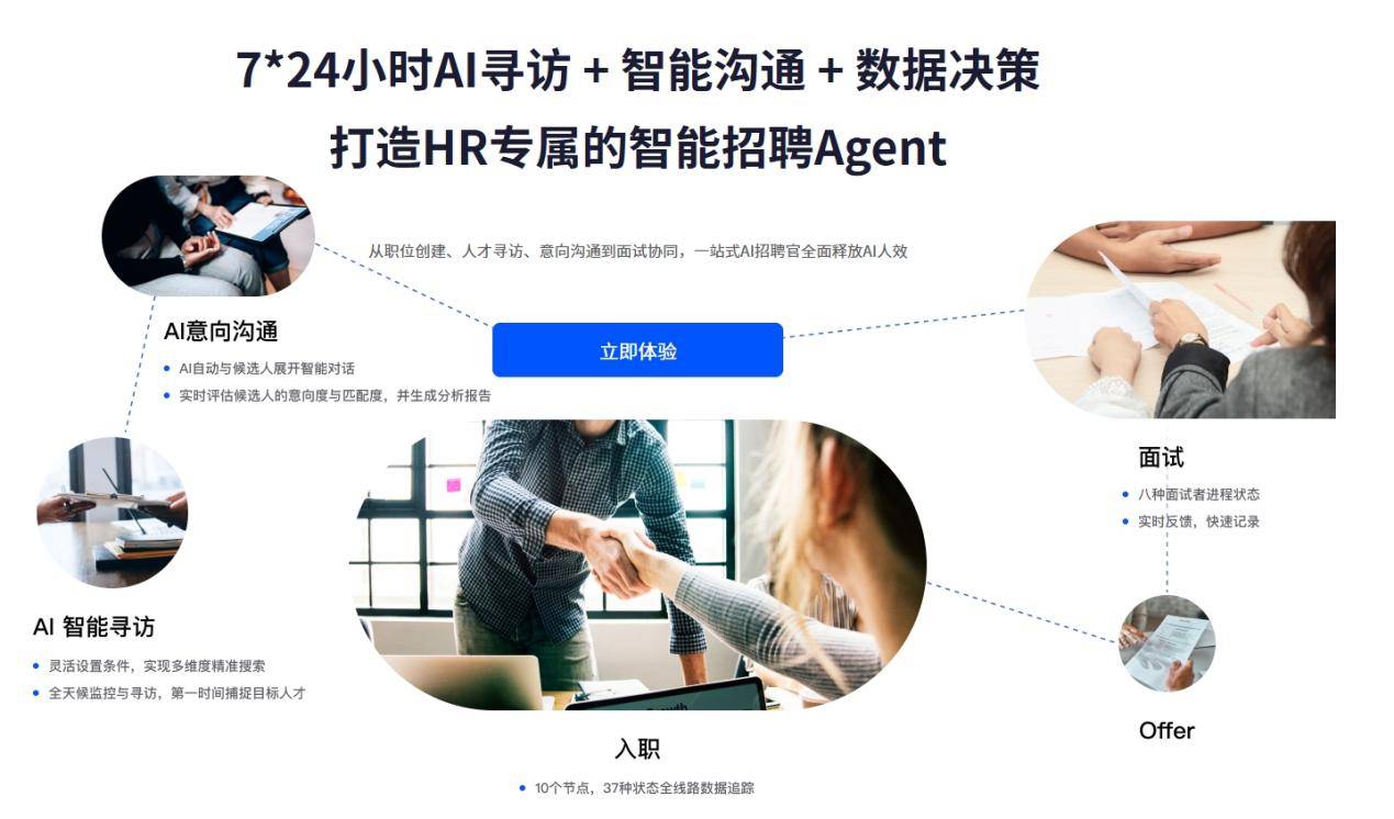 核心优势:在招聘环节加入深度专业测评模型,不仅能帮企业找到人,还能通过AI预测候选人入职稳定性与胜任力。业务覆盖从招聘到人才培养、组织诊断的全链路,适合追求人才质量而非单纯招聘速度的企业。